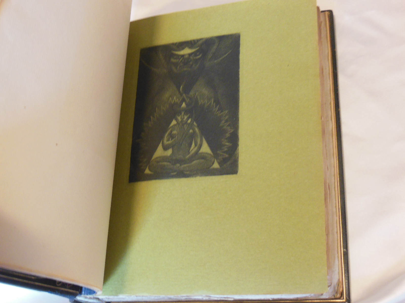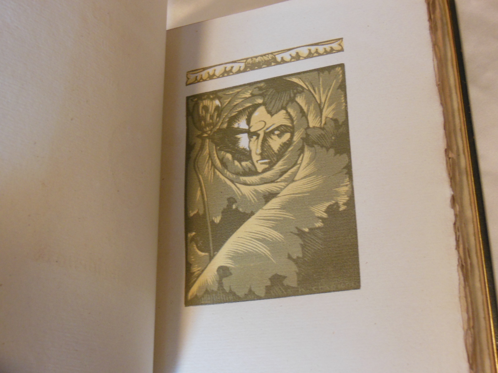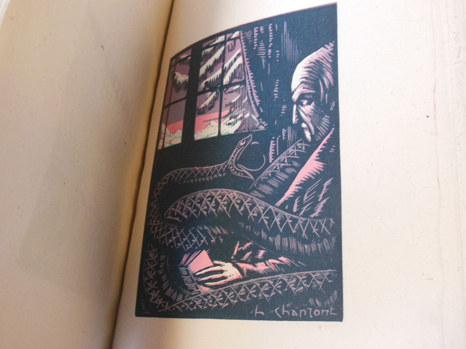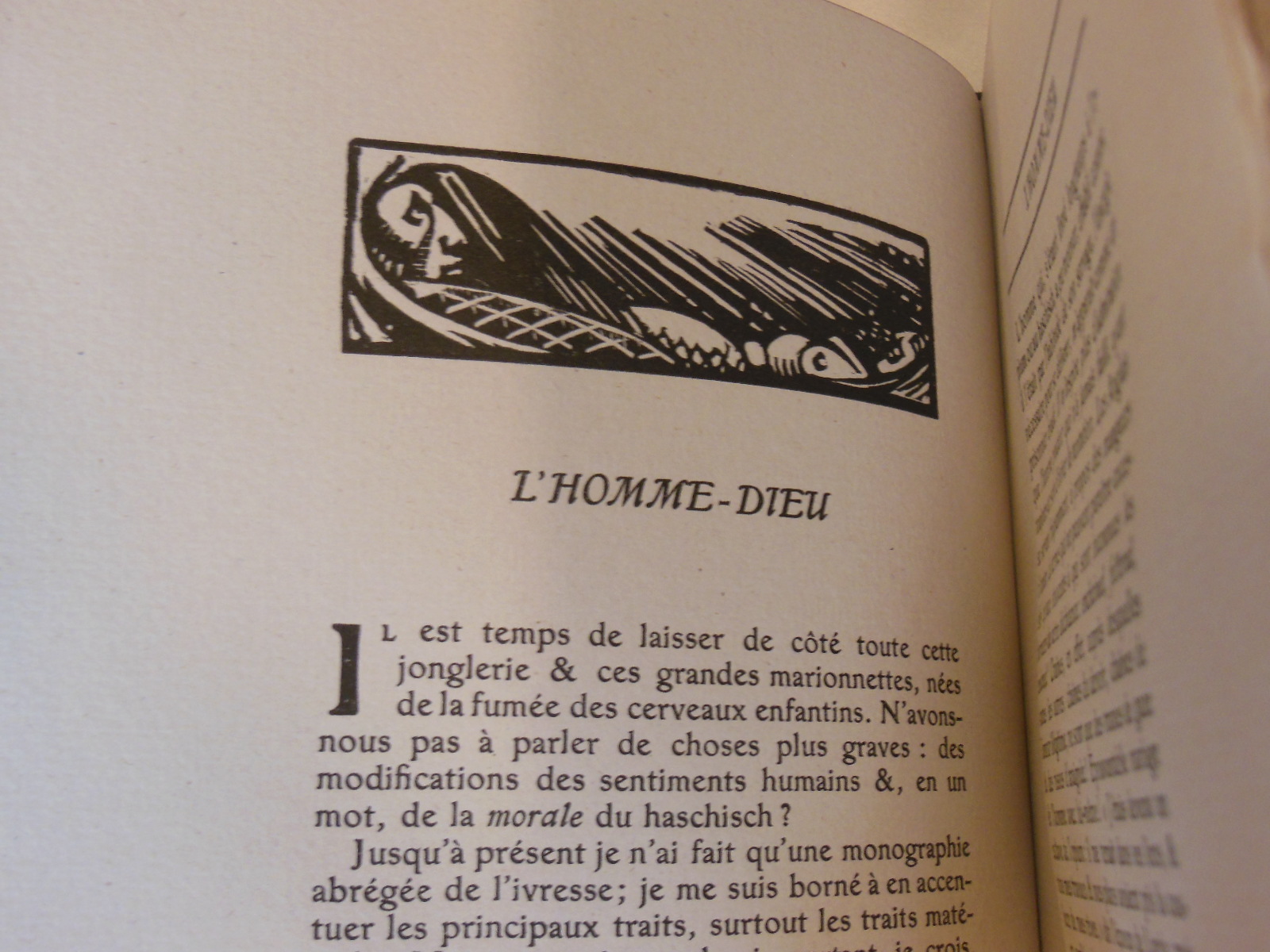 Illustrierte Ausgabe von Baudelaires Paradis Artificiels, einem Essay von 1860, in dem der Dichter die Beziehung zwischen Drogen und poetischem Schaffen diskutiert. Sehr schöne Art-Déco-Holzstiche von Henry Chapront mit schwarzen Ornamenten im Text und farbigen Tafeln.